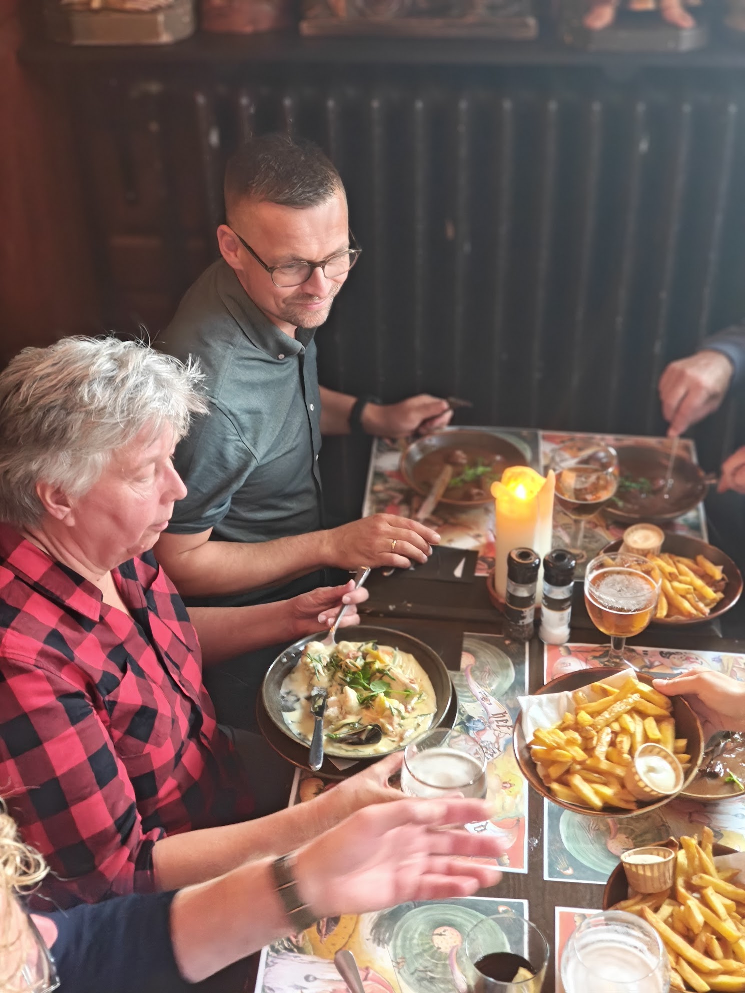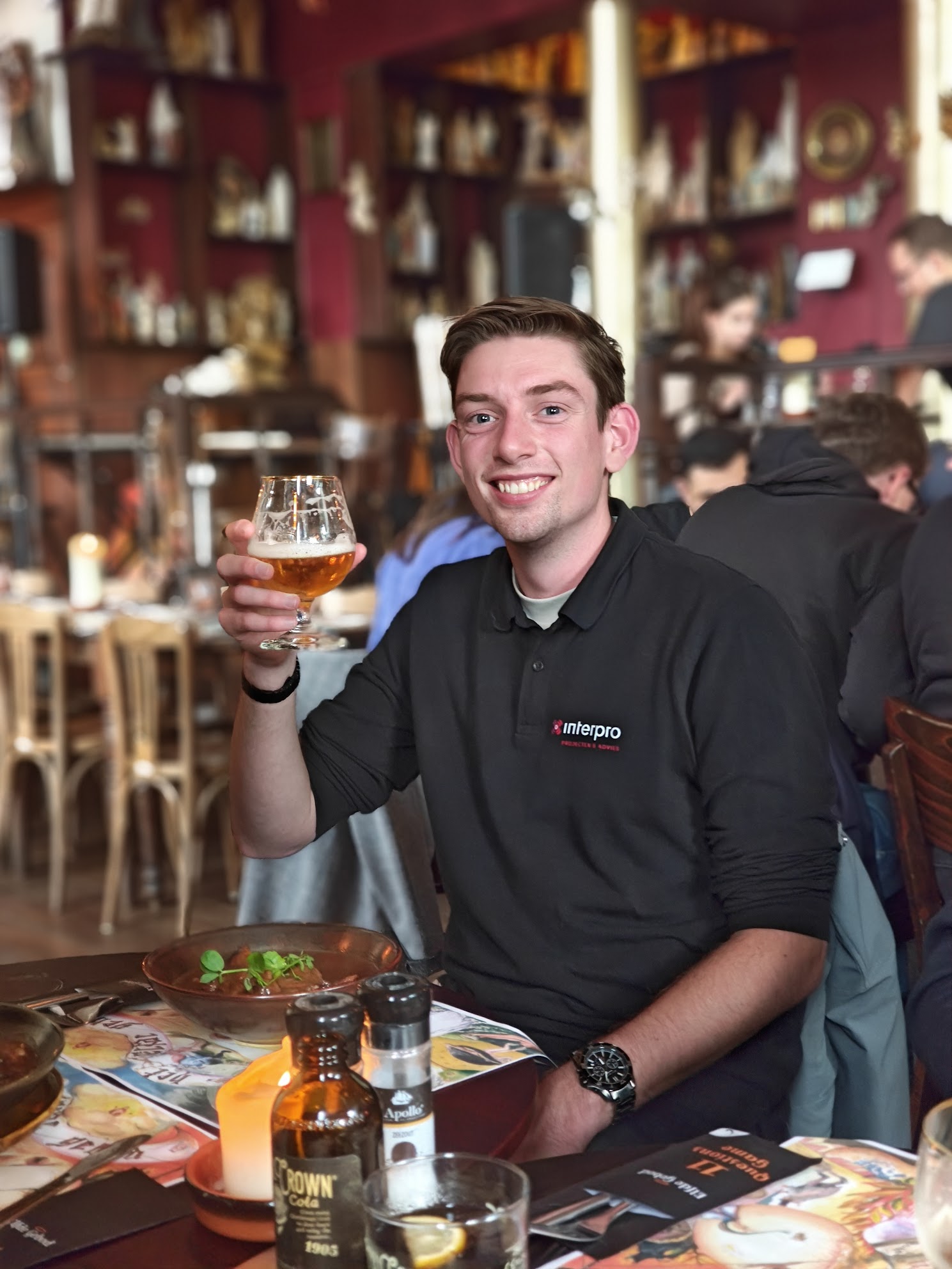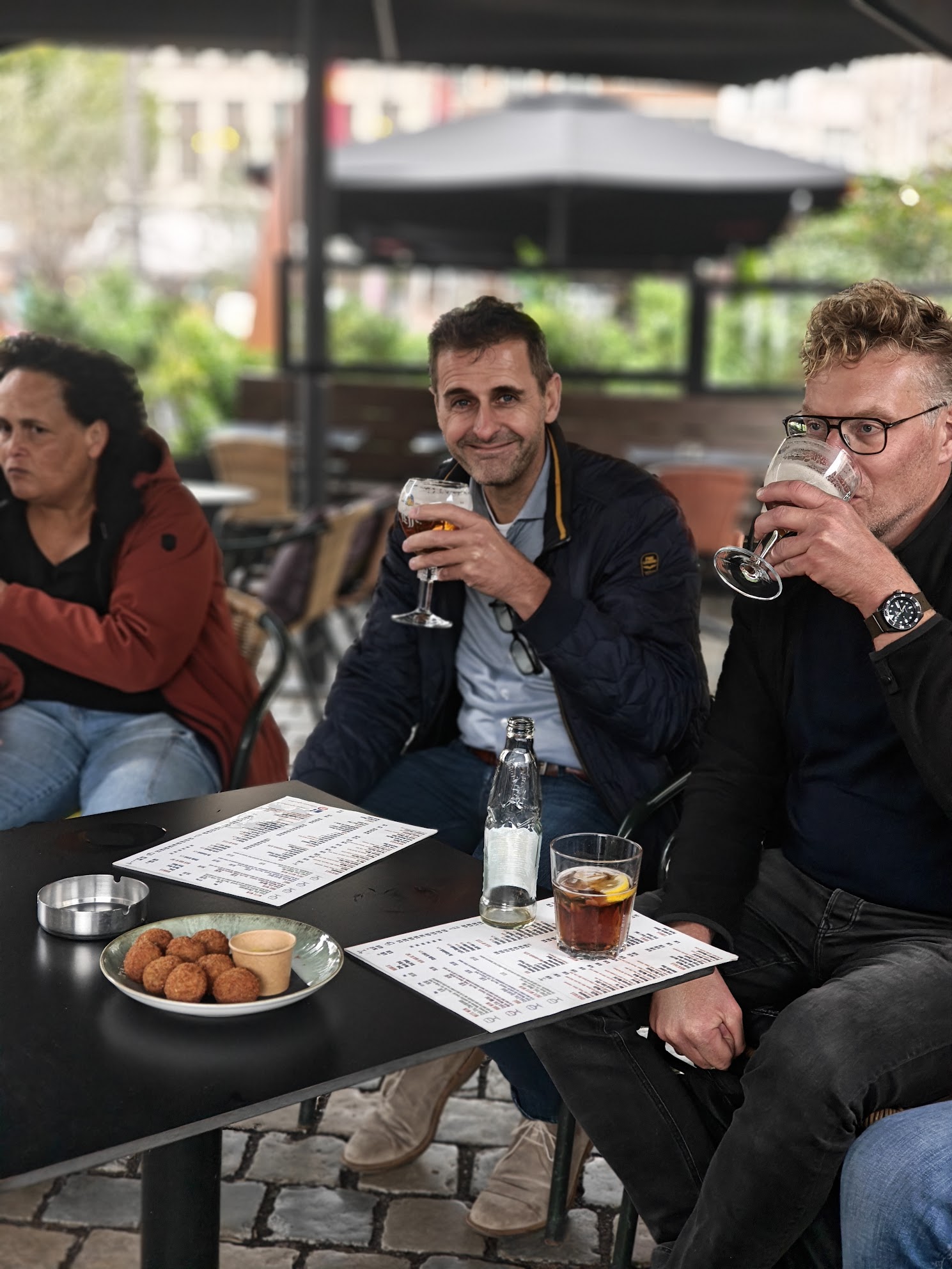 Na afloop genoten we op een terrasje van Belgisch bier en bitterballen, voordat we de dag afsloten met een gezamenlijk diner bij restaurant Elfde Gebod. De terugrit was (dankzij de biertjes?) verrassend rustig. Althans, op de voorste helft van de bus. Achterin werd nog fanatiek de wedstrijd van Feyenoord gevolgd.